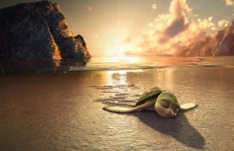 Описание: Маленький черепашонок зеленого цвета только вылупился из яйца и обнаружил, что братья и сестры уже покинули мать, направляясь по песку прямиком к океану. Бедняжка не смог повторить подвиг родственников, ямка оказалась слишком глубокой. Малыш едва не сгорел под палящим солнцем, в попытках выбраться из ловушки. Хищная чайка, кружившая в небе над данной местностью решила воспользоваться горем новорожденного и поймать в качестве собственной наживы. Птица устремилась вниз и схватила кроху острыми когтями, унося над толщей воды.